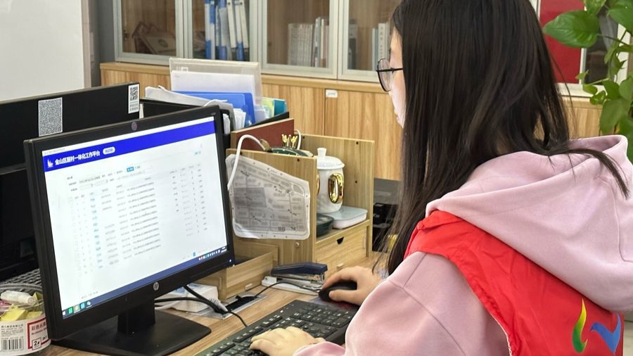 在吕巷镇社区事务受理服务中心,工作人员孙磊正轻点鼠标完成《失业人员摸底调查表》填报。